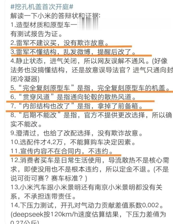 比如雷军之前说机盖“内部结构改了”,小米在辩护时直接说“雷军不懂结构,后来已经改了微博”;还强调“雷军本来就不建议买这个配件”,想证明自己没有欺诈的意思,完全不管发布会上背后大屏幕循环播放赛车呼啸而过的宣传片,对大家买车的影响。另外,小米还说“4.2万元的选装配件不算买车的关键因素”“宣传的内容没写进合同”,所以不构成违约,也拒绝退定金。至于机盖的实用性,小米给出的测试数据显示,车速120km/h时,开孔能增加0.27公斤的下压力,确实有点导流和散热效果,但又说“普通人日常开车用不上这些,就算没用也不算严重违约”。